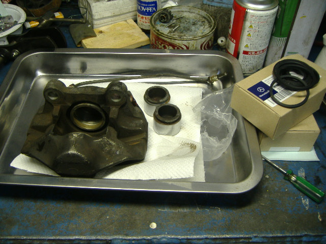 キャリパーのピストンも抜くのが大変、錆ついて
